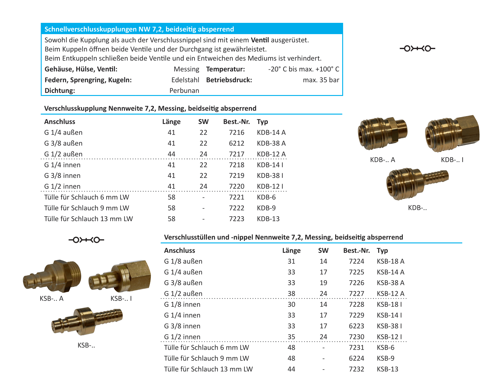 Schnellverschlusskupplungen aus Messing NW 7,2 beidseitig absperrbar