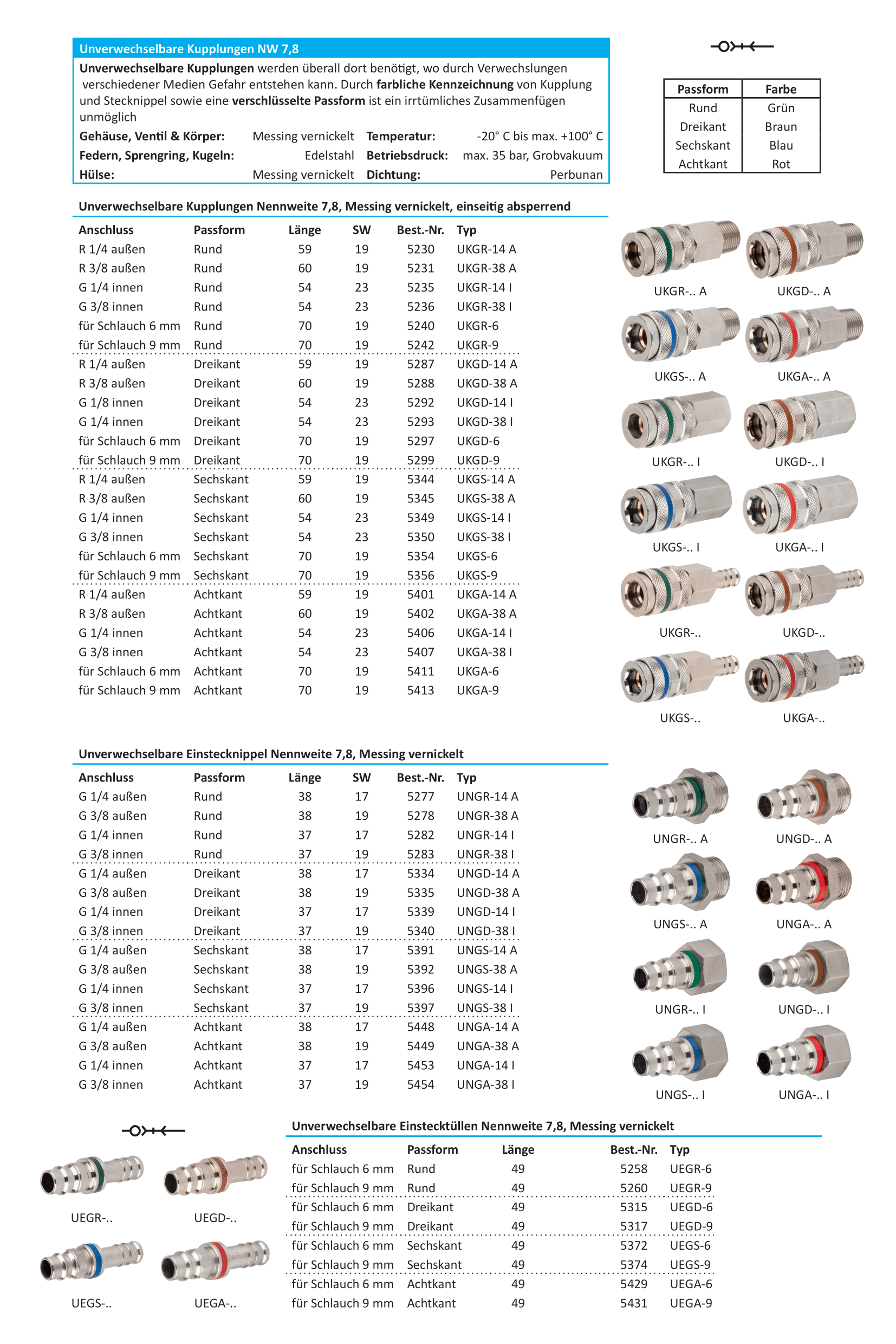 Unverwechselbare Schnellverschlusskupplungen Messing NW 7,8